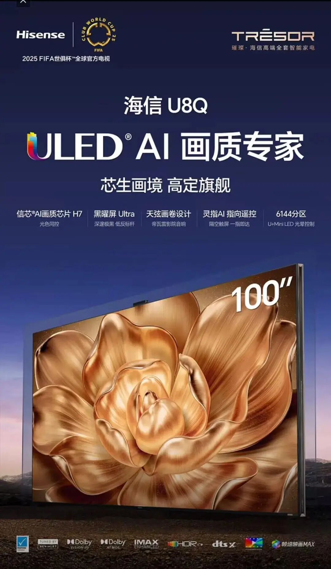 海信电视U8Q系列 以 ULED超画质技术为核心 ,搭载 Mini LED背光精准控光与黑曜屏Ultra技术, 实现百万级分区控光,彻底解决光晕问题,在对比度、色彩精准度和暗场细节上 超越传统OLED 。 信芯H7画质芯片配合HiView引擎,逐帧优化影像 ,而天弦画卷设计搭配帝瓦雷影院音响,打造沉浸式视听盛宴。AI技术深度融入U8Q的智能场景—— 灵指遥控通过AI语音交互实现精准控制 ,同时AI画质引擎能实时分析内容类型,自动匹配最佳显示模式,让每一帧画面都呈现巅峰状态。