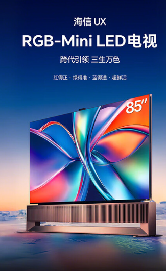 海信RGB-Mini LED电视UX系列 ,开创性地采用RGB三原色背光技术,实现"光色同控"的显示革命。该系列提供85/100/116英寸三个版本,搭载自主研发的RGB光色同控信芯AI画质芯片H7,通过15680点高精色彩控制,带来远超量子点技术的色彩表现,同时节能20%以上。产品配备1.28%超低反光率的黑曜屏Ultra、帝瓦雷6.2.2声道音响系统,以及L3+级AI智能,在画质、音效和智能体验上实现全面突破,重新定义高端电视标准,为消费者带来前所未有的视听享受。