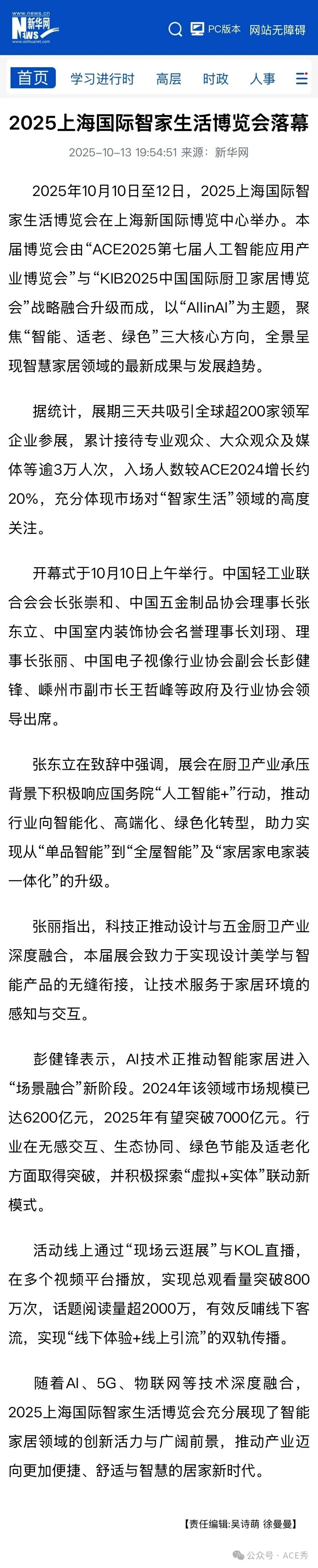 2025上海国际智家生活博览会以“AllinAI”为主题,聚焦智能、适老、绿色三大方向,展示智慧家居最新成果,吸引全球200余家企业参展,推动智能家居产业向高端化、智能化升级。